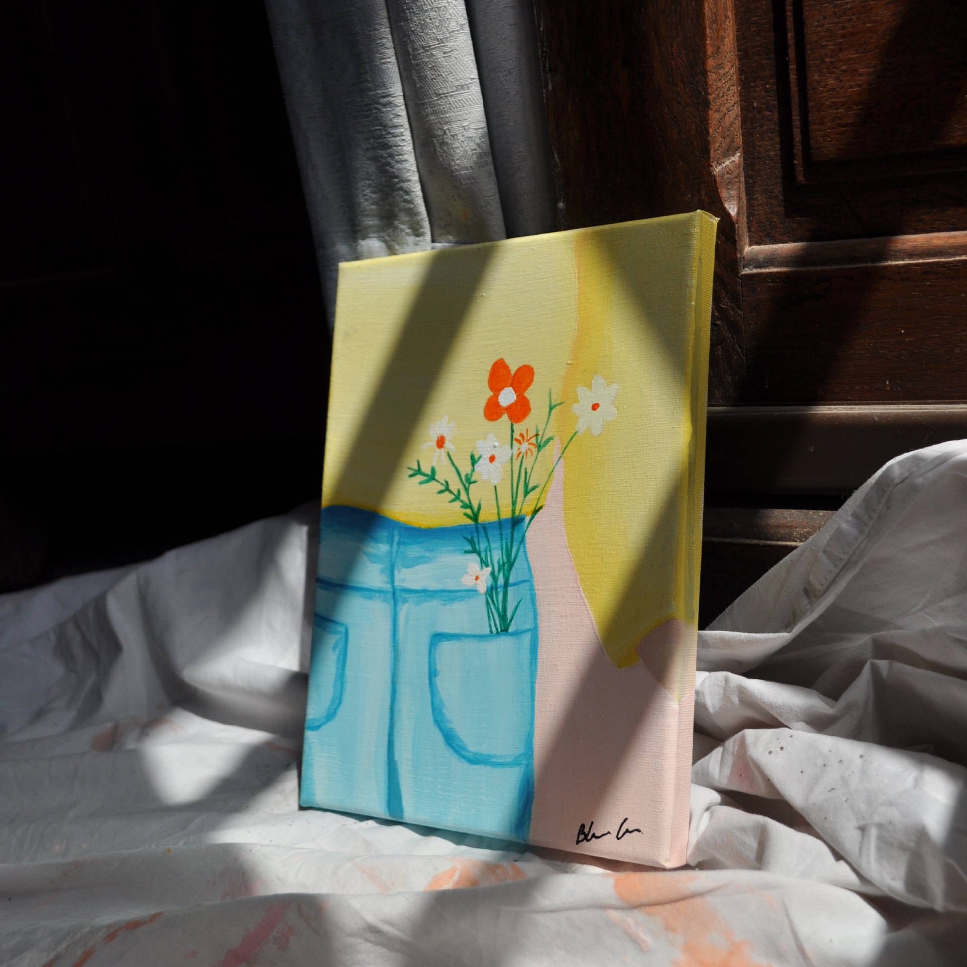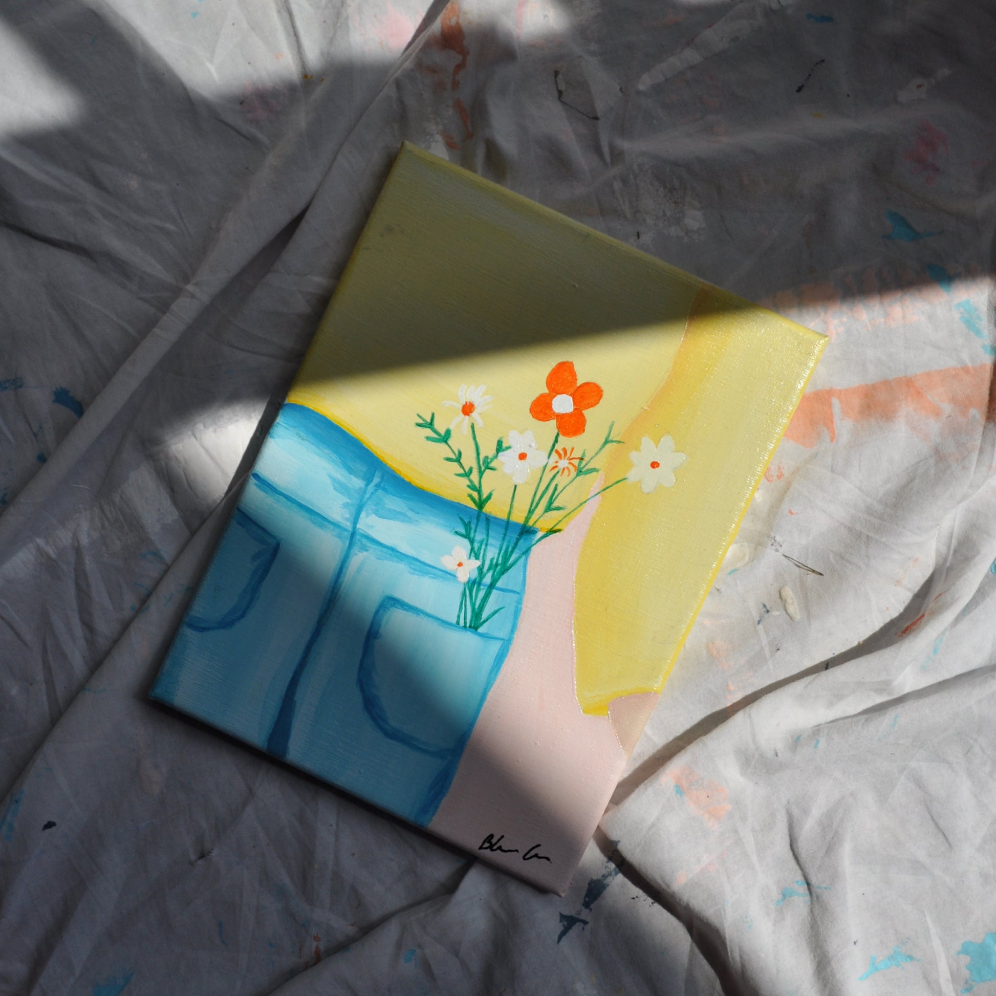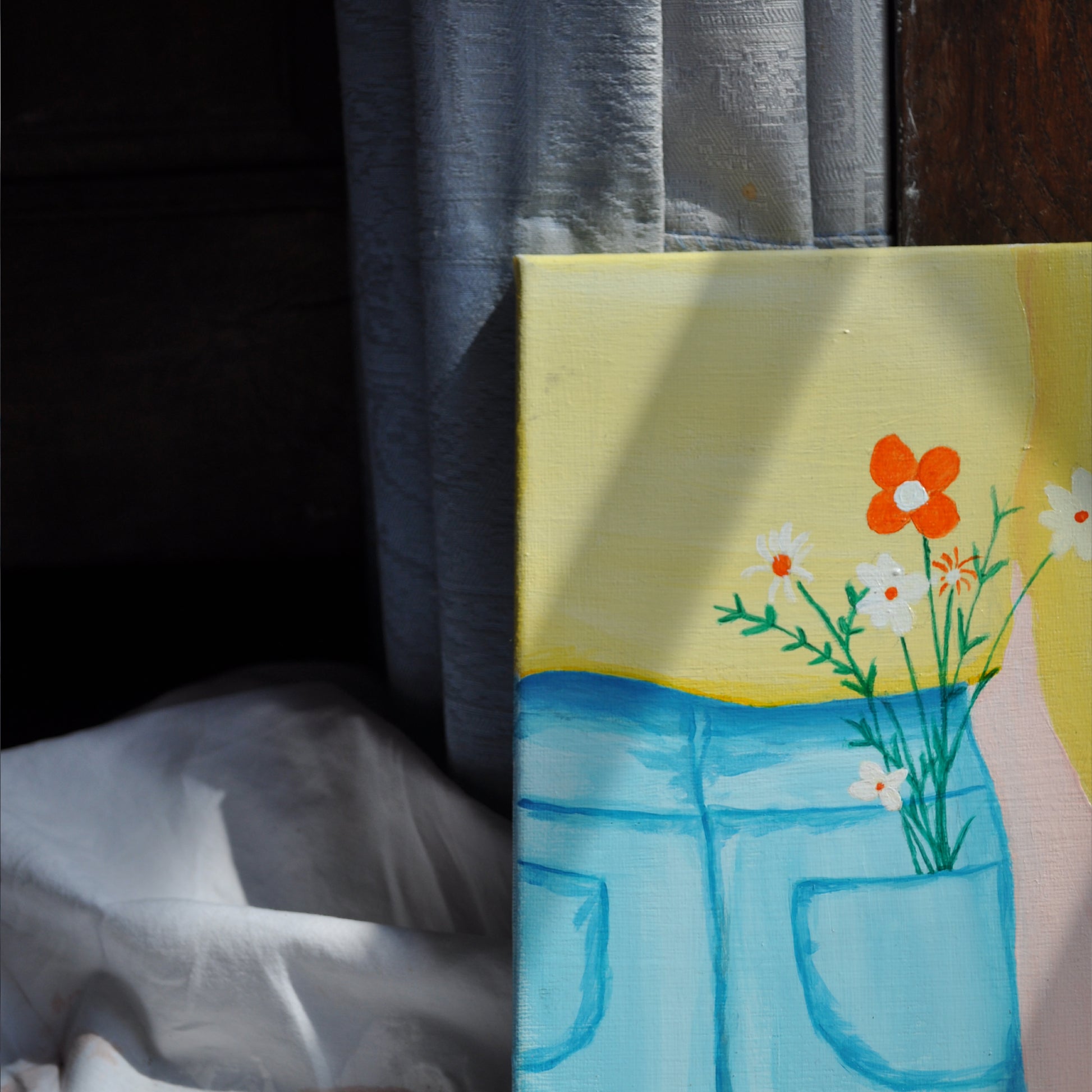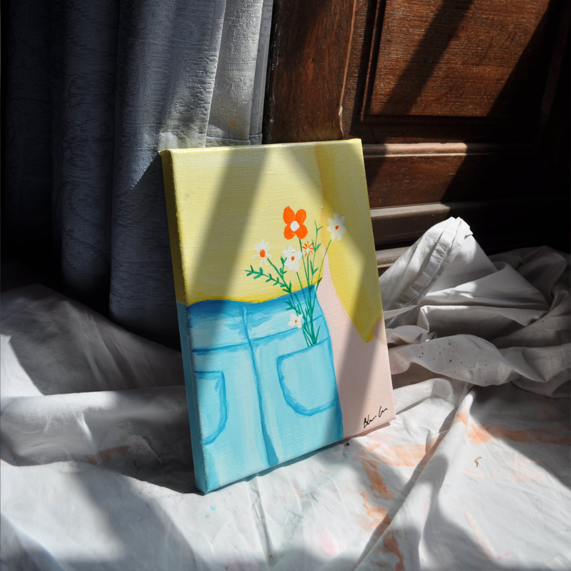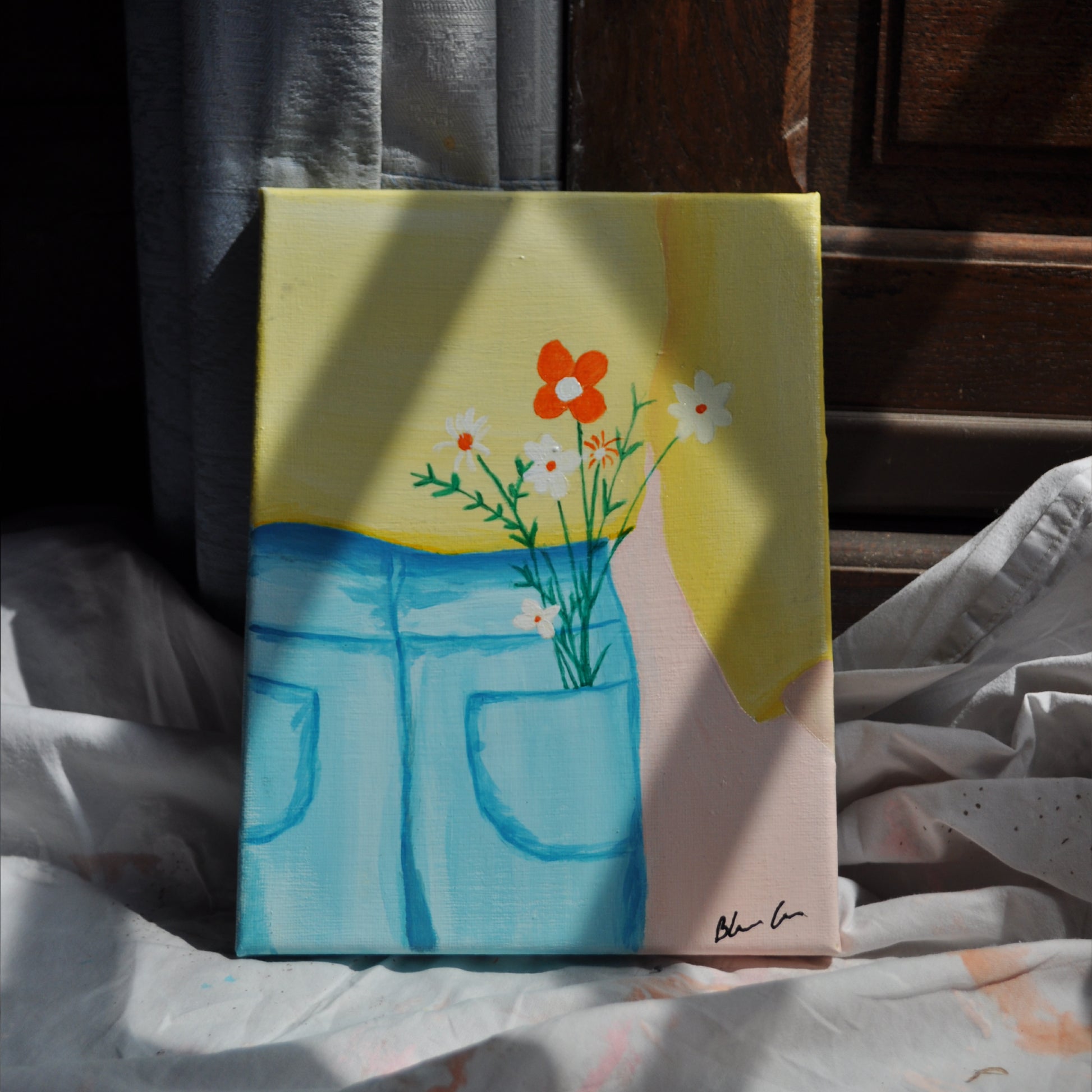 Cette toile dégage une douce simplicité, empreinte de tendresse estivale. On y découvre une silhouette féminine, suggérée avec délicatesse, vêtue d’un jean bleu ciel et d’un haut jaune pastel. Dans la poche, de petites fleurs des champs semblent avoir trouvé refuge, comme cueillies au fil d’une balade insouciante.